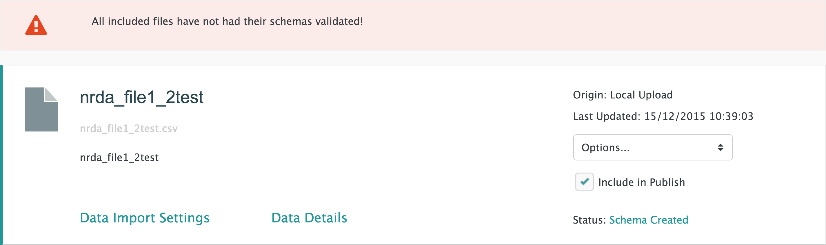 The Data Details panel is used to view and edit settings for data uploaded via the Data Files page. The settings in the Data Details panel should be checked before the Dataset is published.