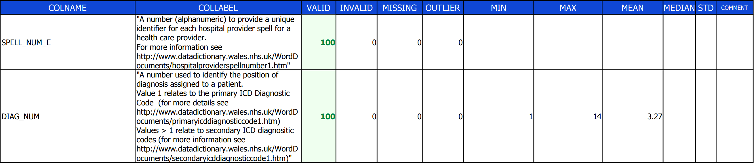 Summary analysis of all tables in the Data Quality Report