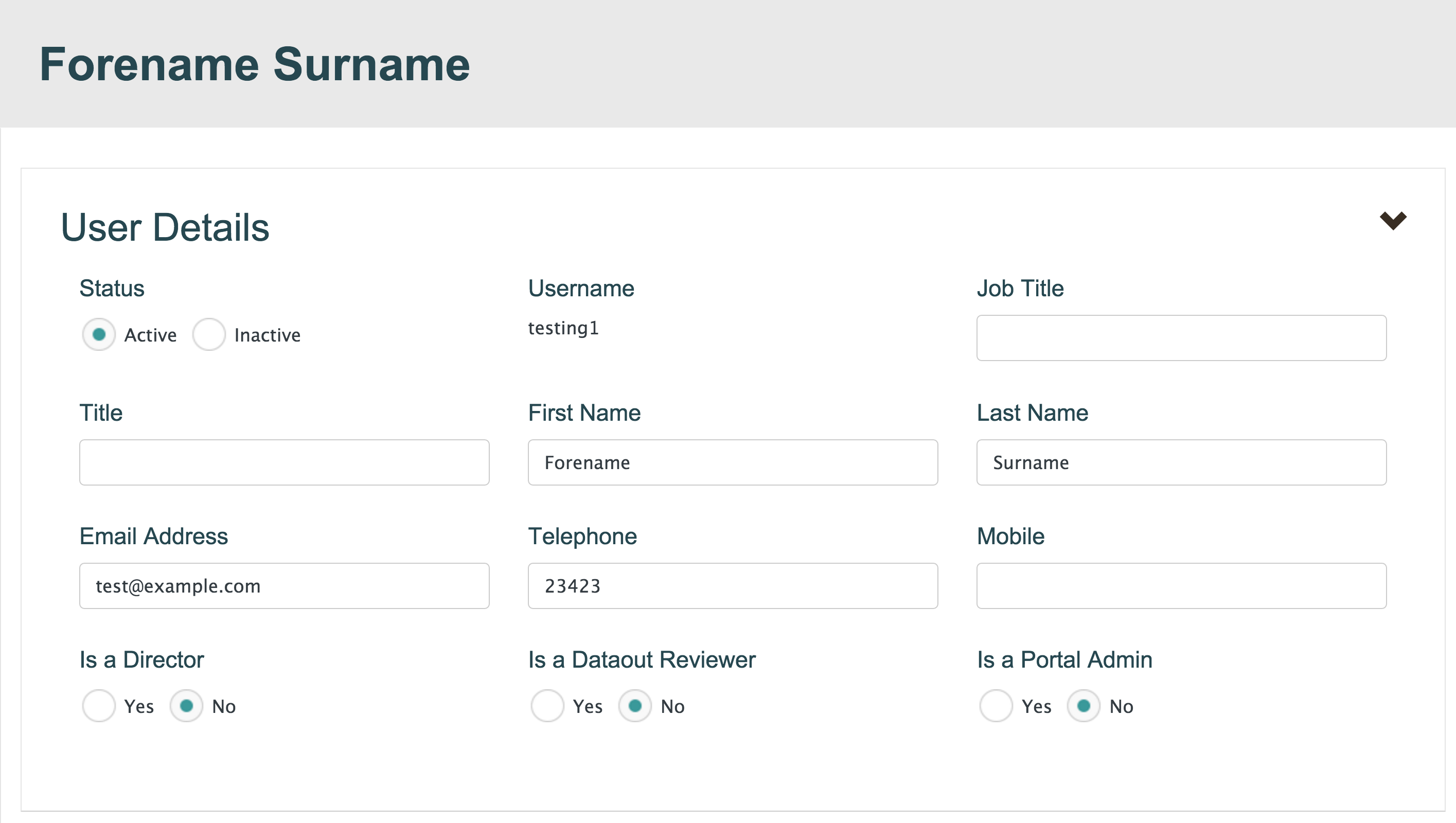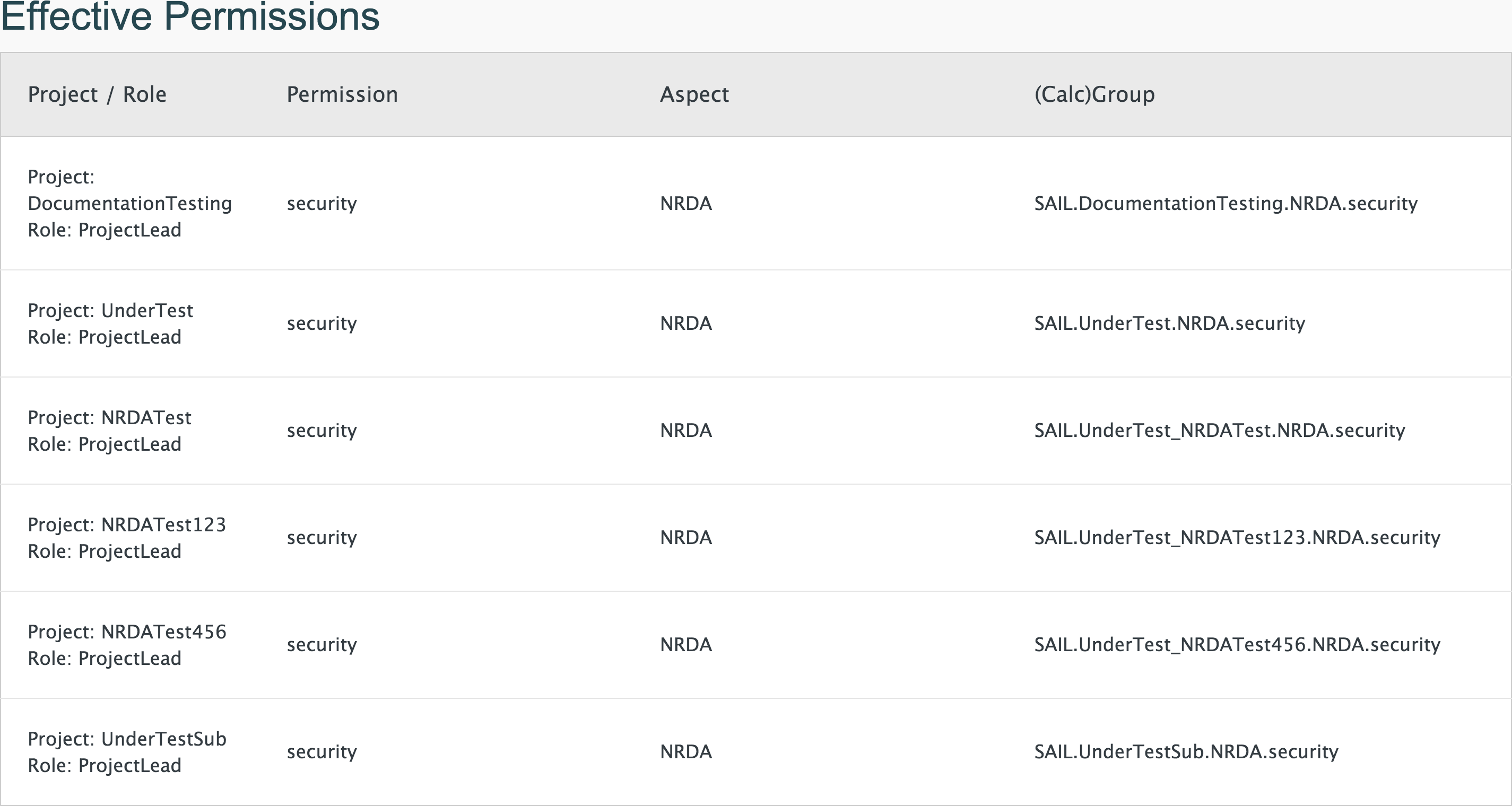 The final section of the page displays the permissions and aspects associated with the selected user account. These settings are defined via the Permissions section of the Projects page.
